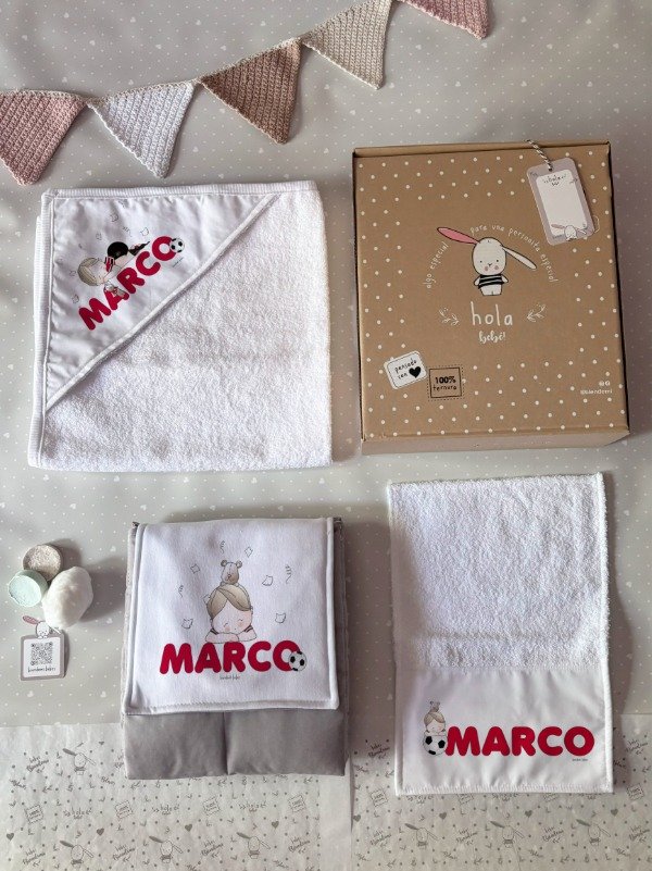 El combo para la hora de estar bien limpito y que sorprenderá a los papás por la ternura de sus diseños y por encontrarse con el nombre del bebé en cada pieza del set.