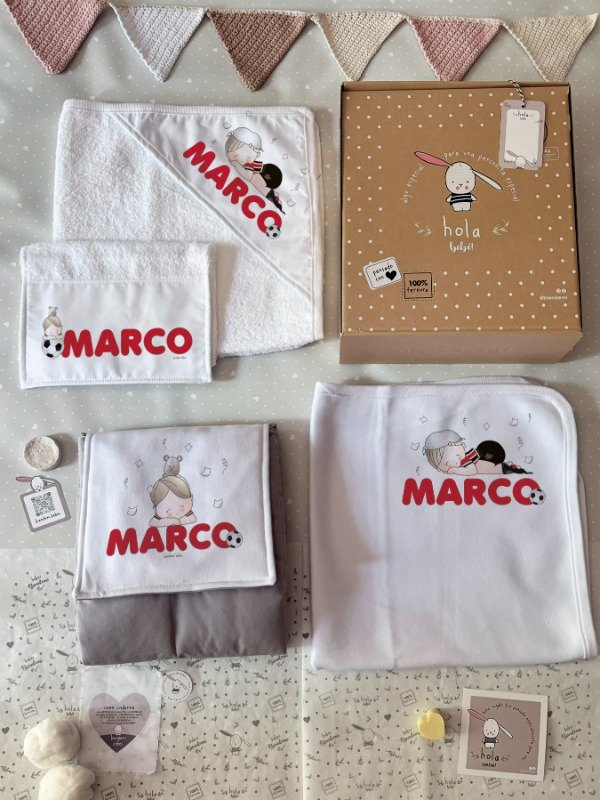 El combo para hacer un súper regalo al bebé por nacer, con cosas siempre útiles y que sorprenderán por la ternura de sus diseños y por encontrarse con el nombre del bebé en cada pieza del set.