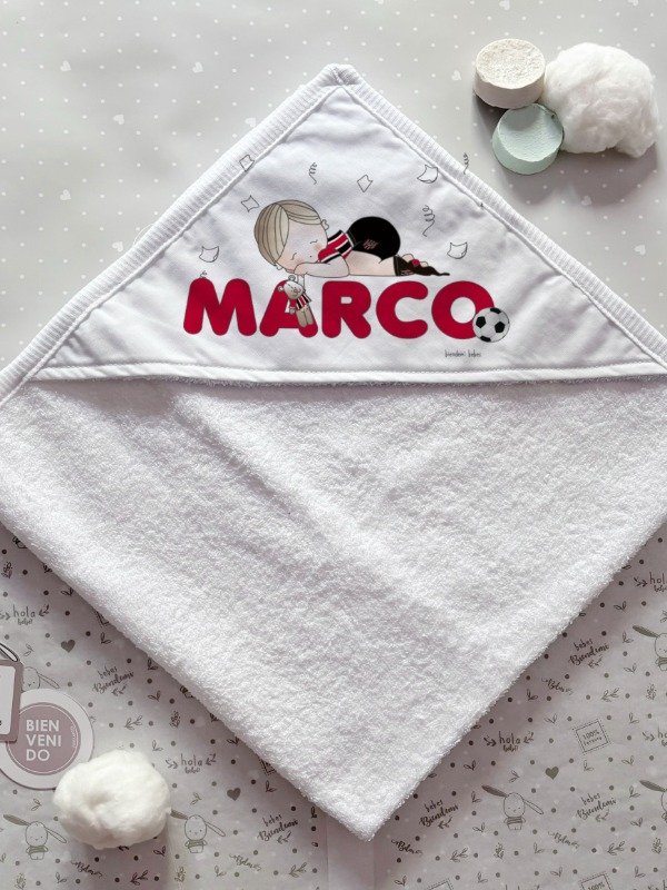 Estampa realizada por transfer sobre la capucha del toallón, personalizada con el nombre del bebé.